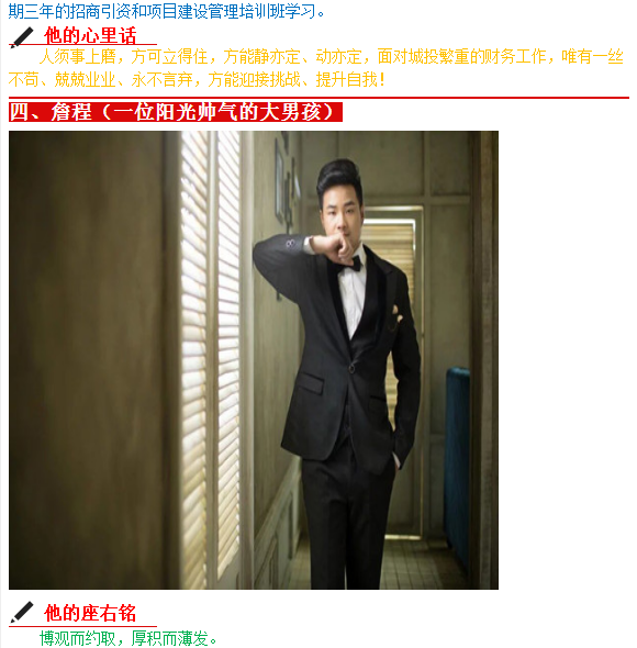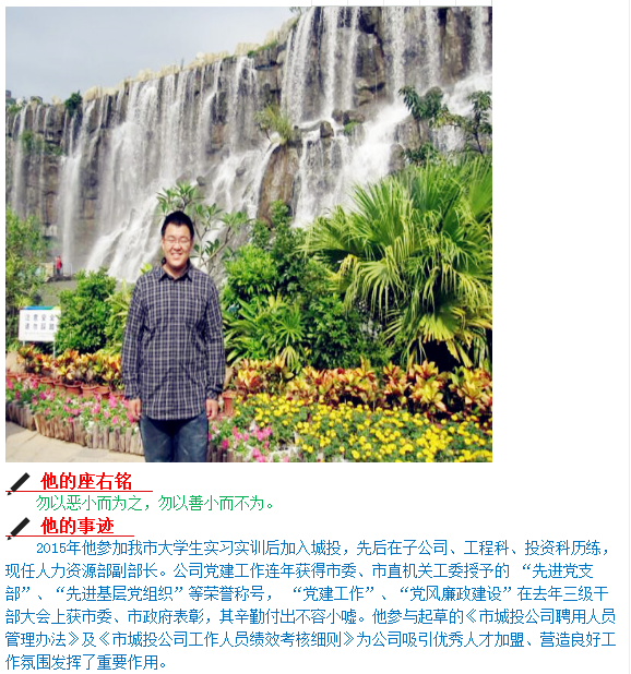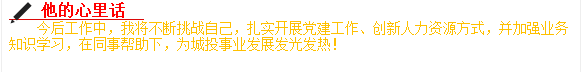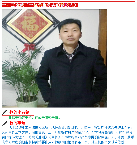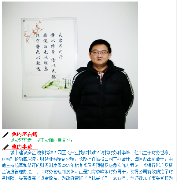 在3月1日召開的三月份工作部署會上,公司領導班子集體為五位獲得“城投之星”稱號的同志頒獎。公司副書記、總經(jīng)理魯斌同志在會上號召全體干部職工向五位同志學習,并表示今后將在薪酬提升、職位晉級等方面予以優(yōu)先考慮。以下是五位獲獎同志的簡介,讓我們品讀其座右銘、學習其先進事跡并聽聽他們的心里話吧!