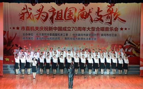 9月8日,黃岡市直機關(guān)慶祝新中國成立70周年大型合唱音樂會“我為祖國獻支歌”在市職工活動中心隆重舉行。比賽由市委直屬機關(guān)工委、市委文明辦、市總工會主辦,市文旅局、市城管執(zhí)法委承辦,共39支合唱隊3000人報名參加初賽。在第四黨建區(qū)的安排部署下,我公司高度重視、選派人員、認真?zhèn)滟、激情演藝,在“我為祖國獻支歌”——慶祝新中國成立70周年大型合唱音樂會初賽中取得良好成績。