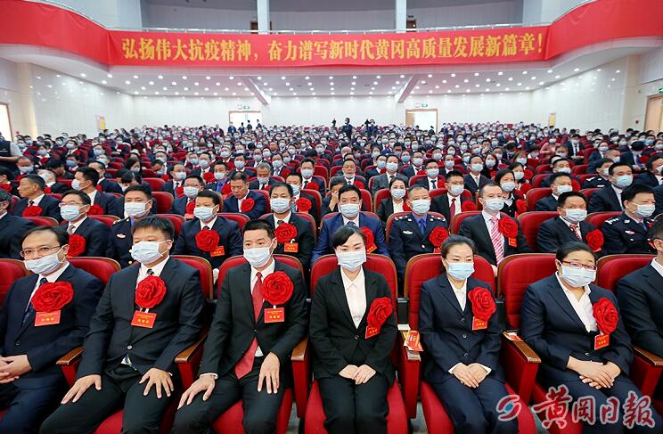 會場主席臺上方,懸掛“黃岡市抗擊新冠肺炎疫情表彰大會”的橫幅;幕布正中,國徽高懸,10面紅旗左右分列;二樓眺臺,懸掛“弘揚偉大抗疫精神,奮力譜寫新時代黃岡高質量發(fā)展新篇章!”的橫幅。