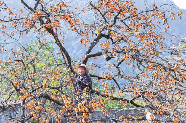 10月22日,羅田縣三里畈鎮(zhèn)鏨字石村農(nóng)民在樹上打柿子。